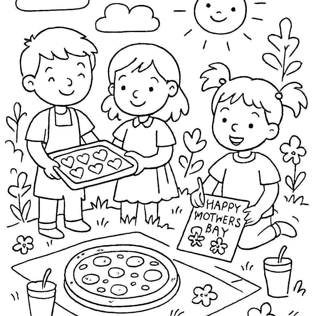 Disegno da colorare di tre bambini che preparano dolci e festeggiano la Festa della Mamma con un cartello e una pizza.