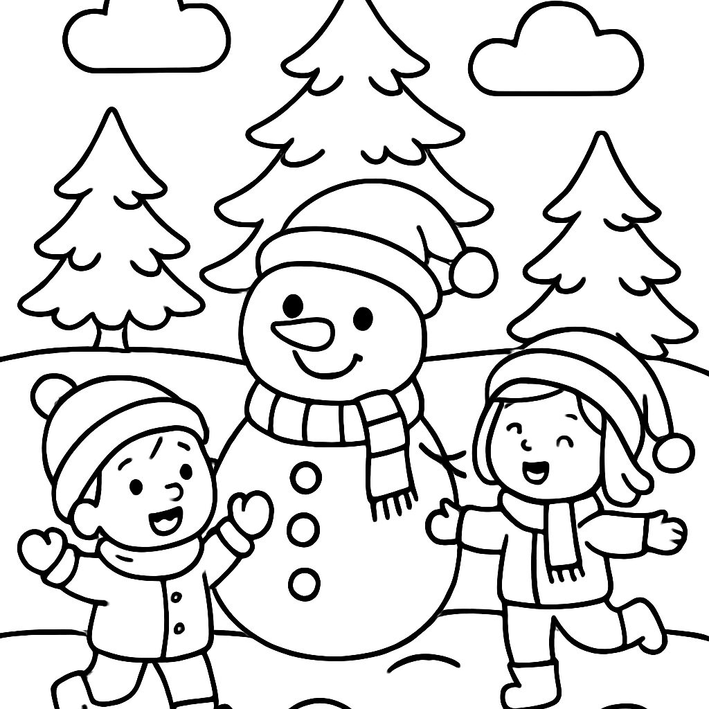Disegno da colorare di due bambini felici accanto a un pupazzo di neve, circondati da alberi e nuvole.