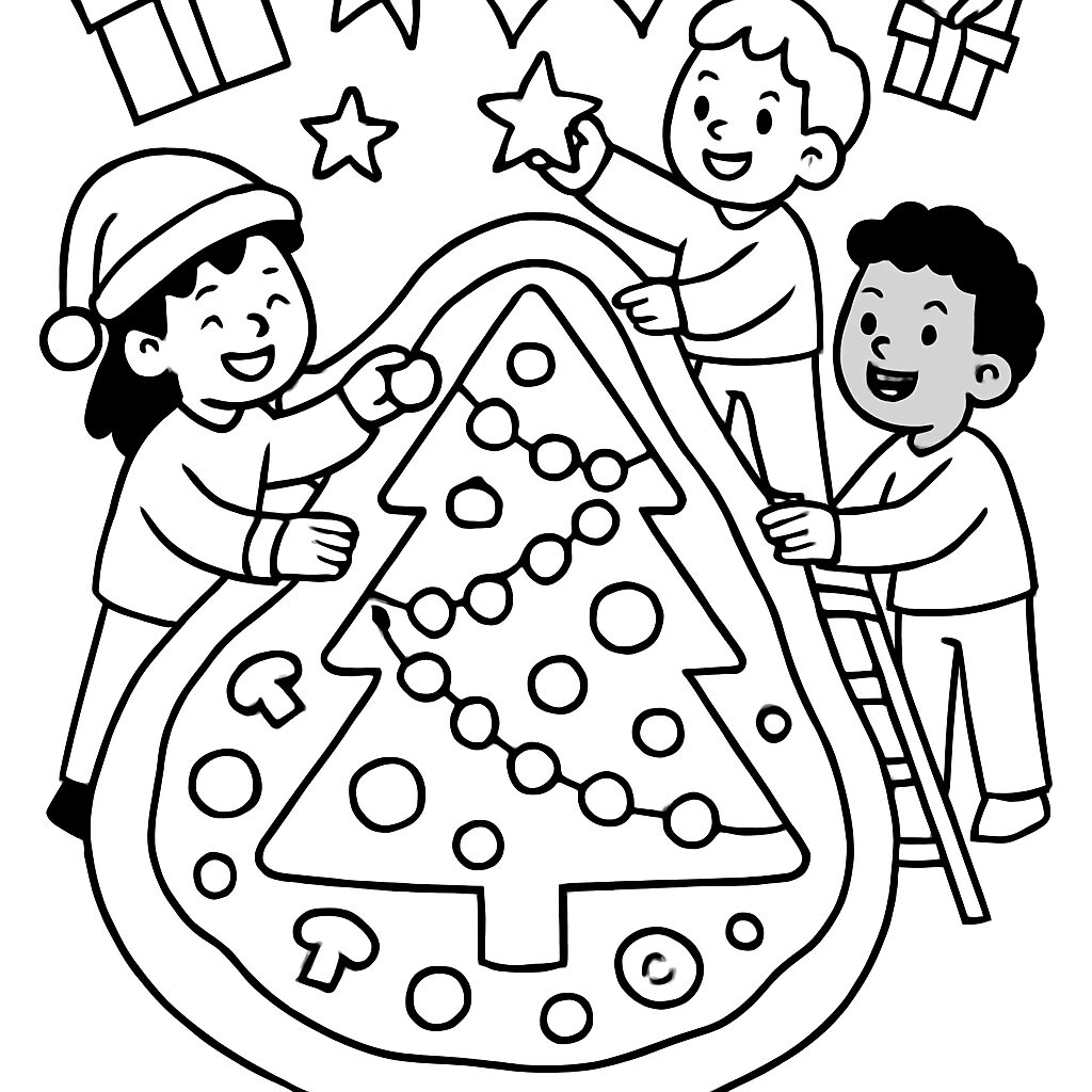 Tre bambini sorridenti decorano un albero di Natale con palline e stelle, circondati da regali. Disegno da colorare festoso e allegro.