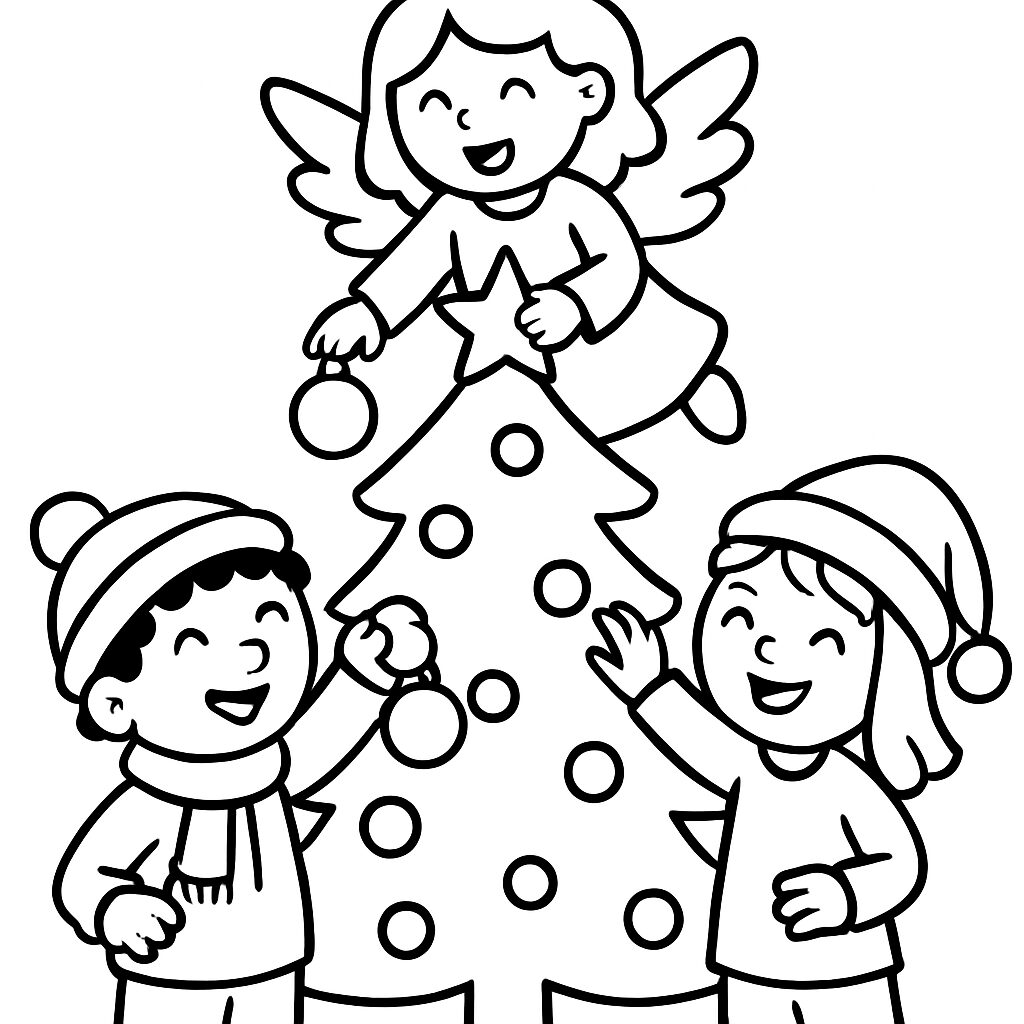 Disegno da colorare di bambini e un angelo mentre decorano un albero di Natale.