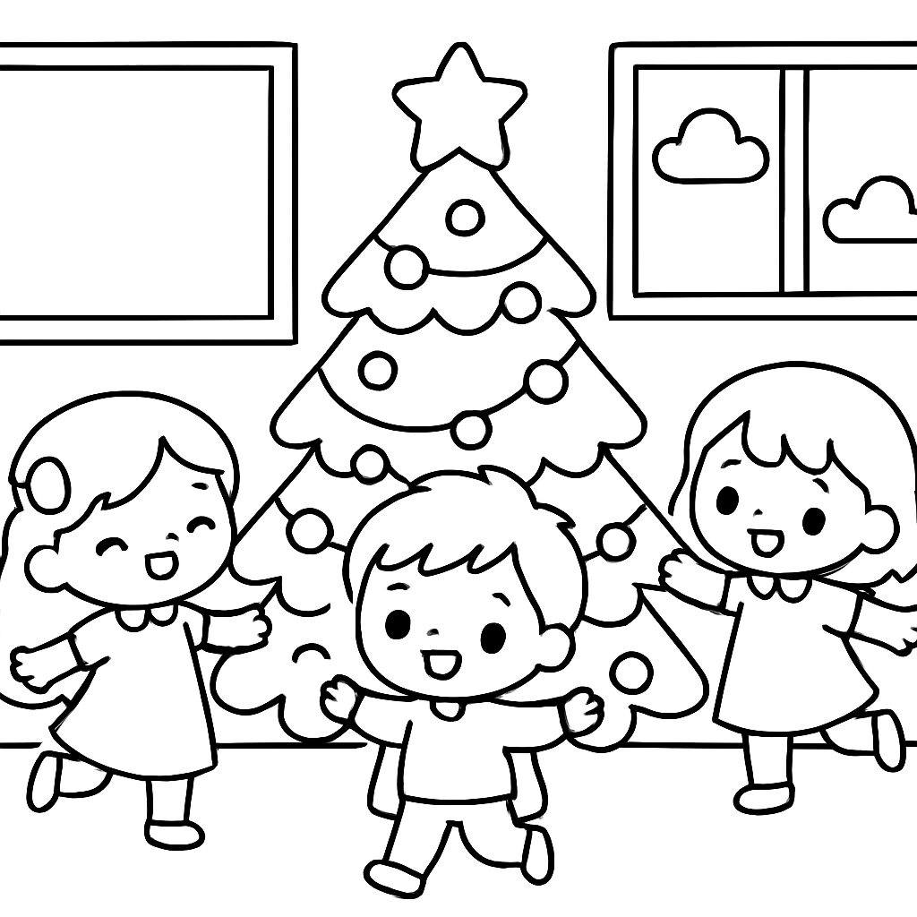 Disegno da colorare di tre bambini che si divertono attorno a un albero di Natale decorato.
