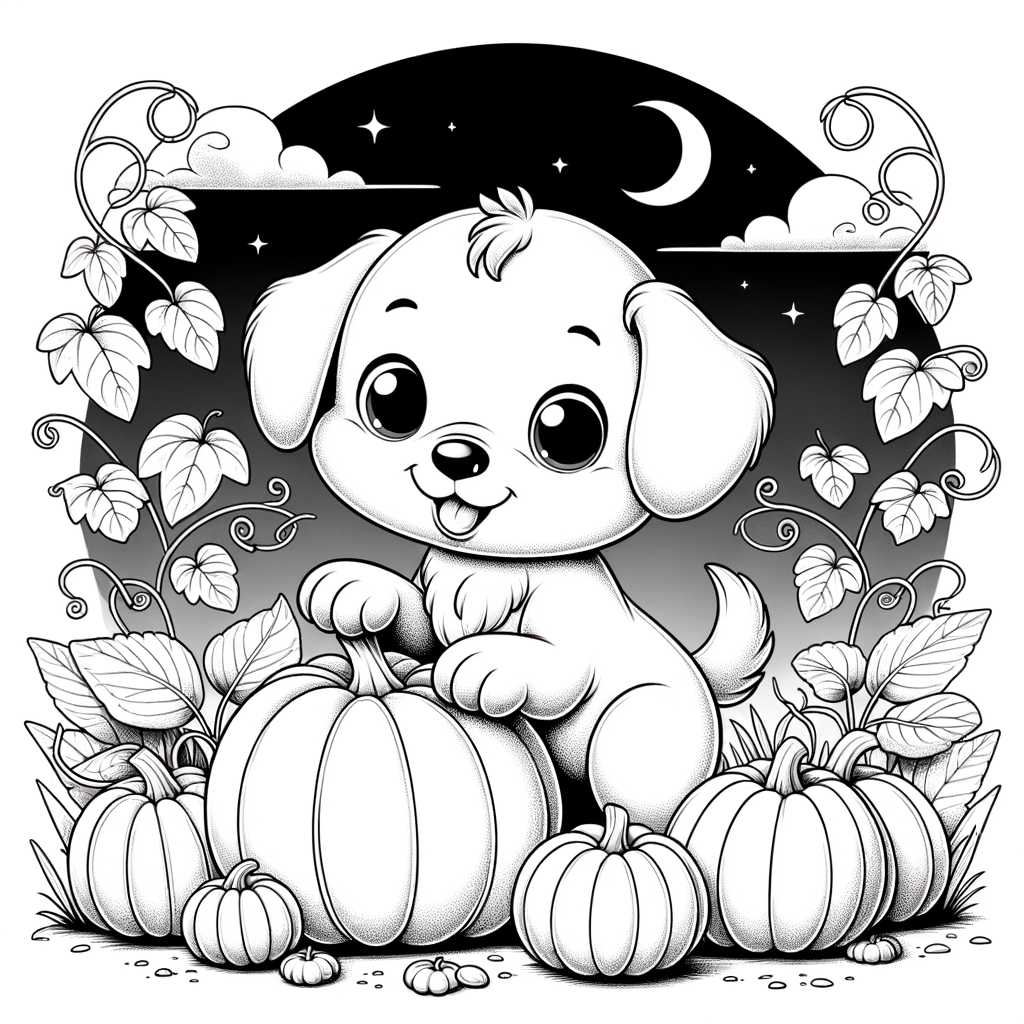 Un adorabile cagnolino gioca tra le zucche, perfetto per un disegno da colorare in tema Halloween.