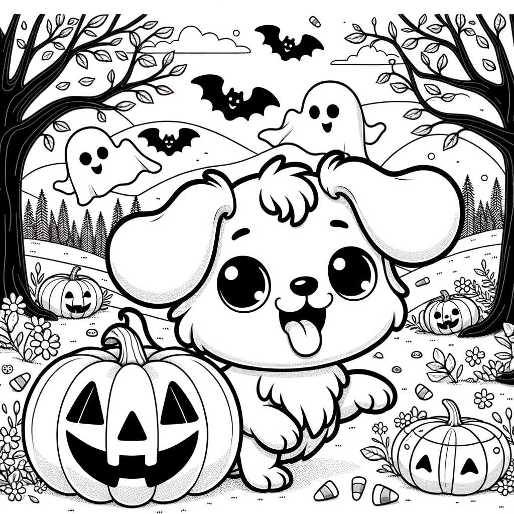 Un adorabile cagnolino gioca tra zucche decorate e fantasmi, perfetto per un disegno da colorare di Halloween.