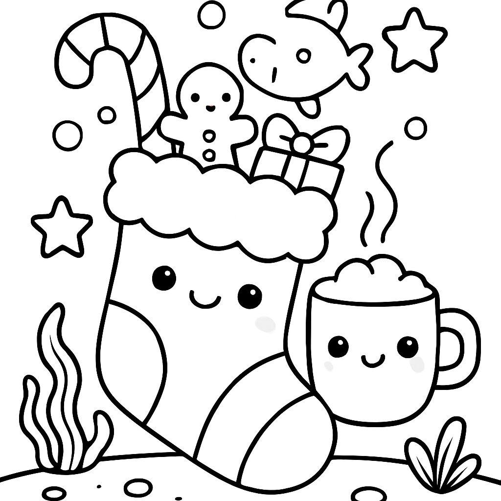 Un disegno da colorare che rappresenta una calza di Natale sorridente con dolcetti, un pesciolino e una tazza di cioccolata calda, circondato da stelle e piante marine.