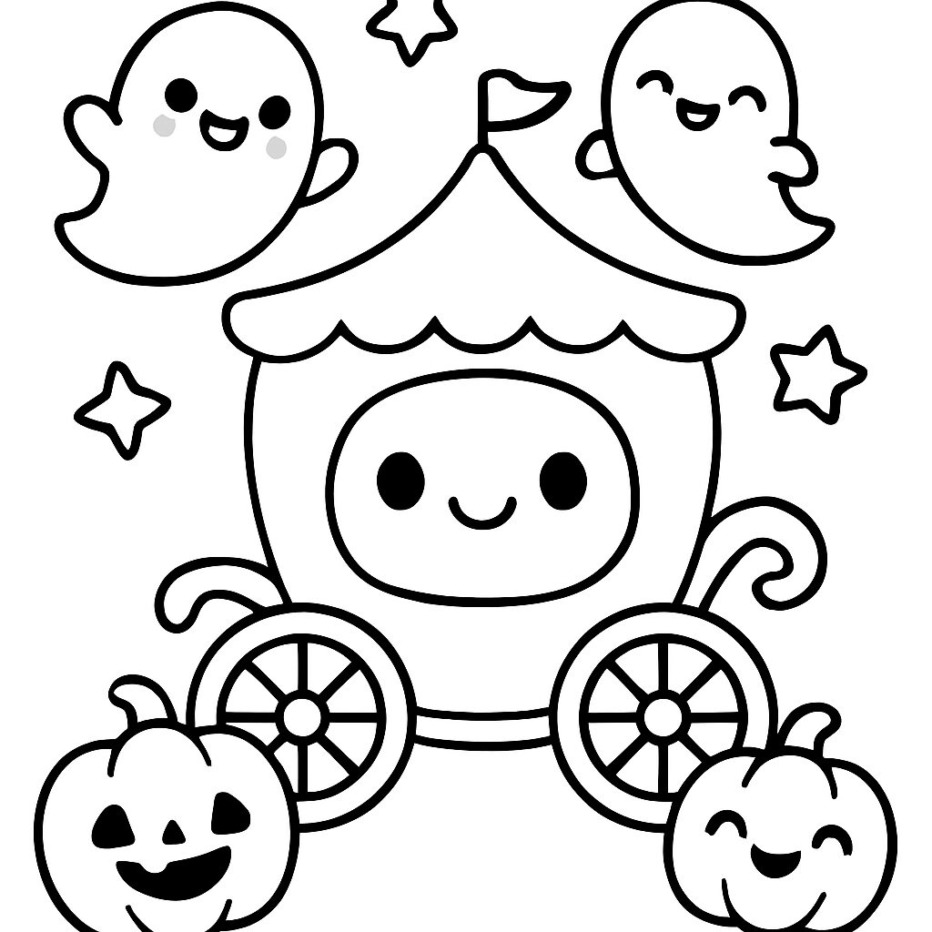 Un disegno da colorare di una carrozza felice circondata da fantasmi e zucche sorridenti, con stelle brillanti.