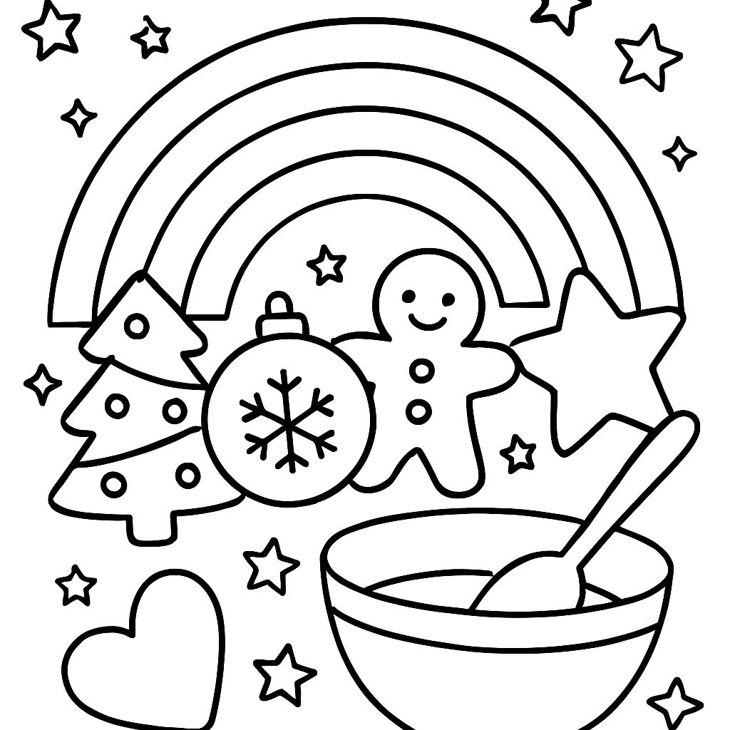 Disegno da colorare di Natale con dolcetti e arcobaleno