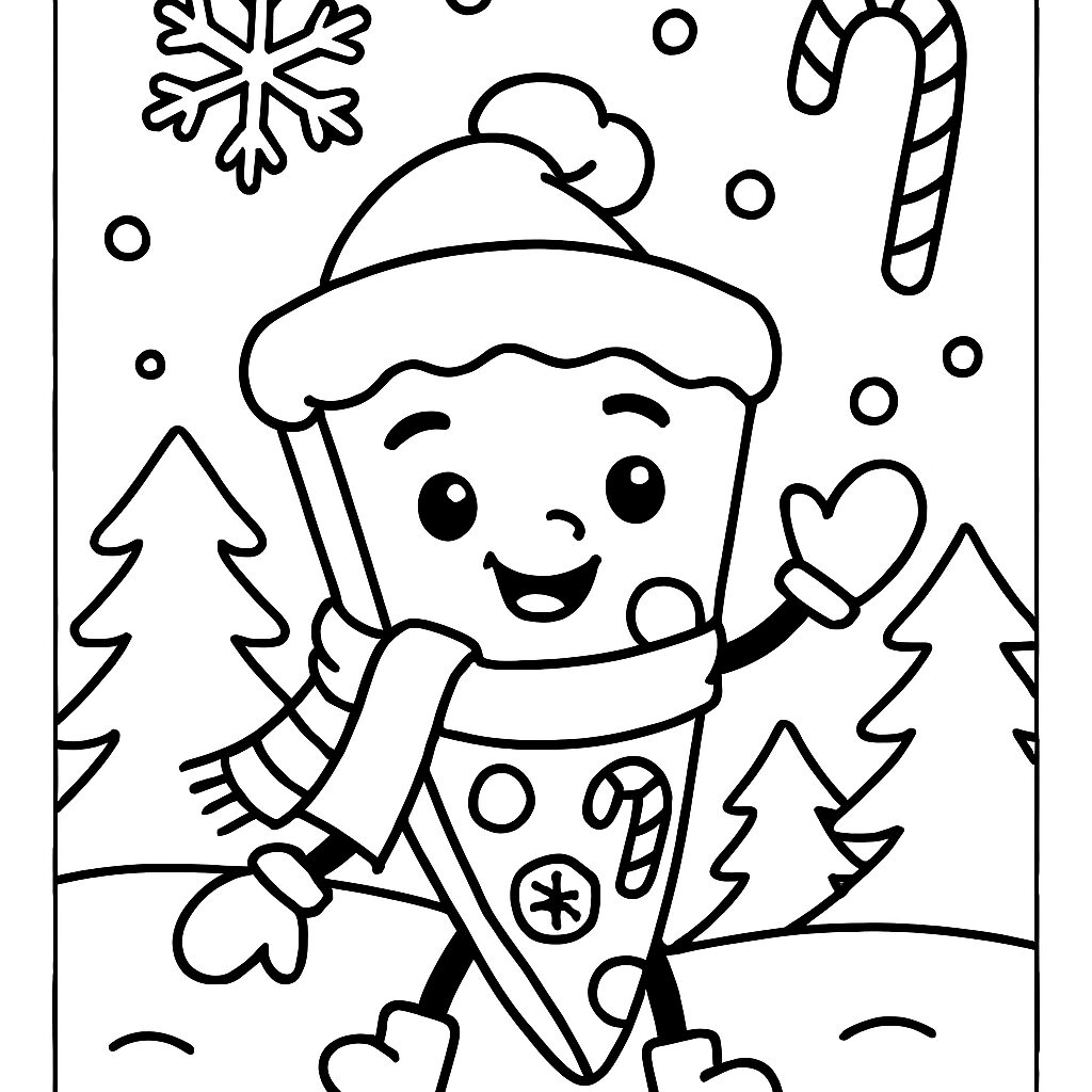 Un dolce a forma di gelato indossa un cappello e una sciarpa, circondato da alberi di Natale e fiocchi di neve, pronto per essere colorato.