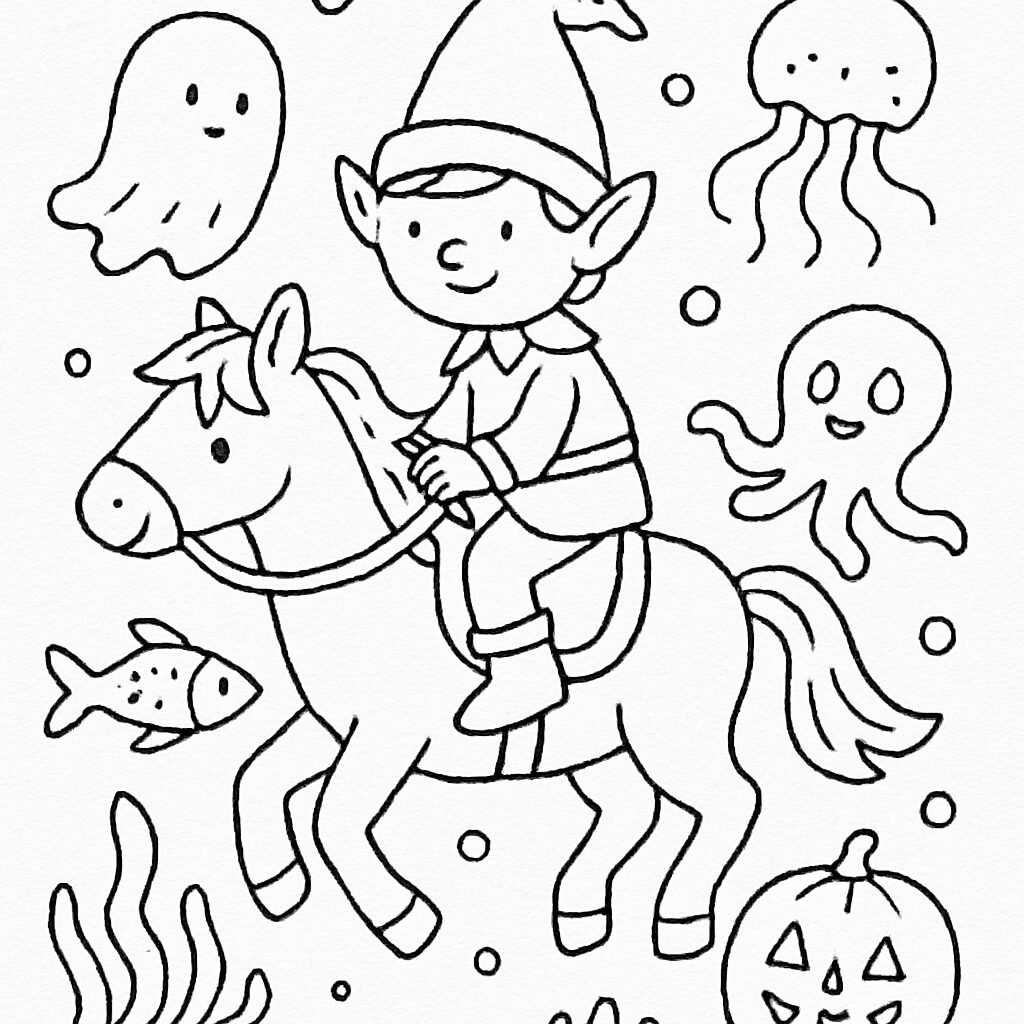 Un elfo sorridente cavalca un pony circondato da fantasmi, meduse e un polpo, in un disegno da colorare vivace e divertente.