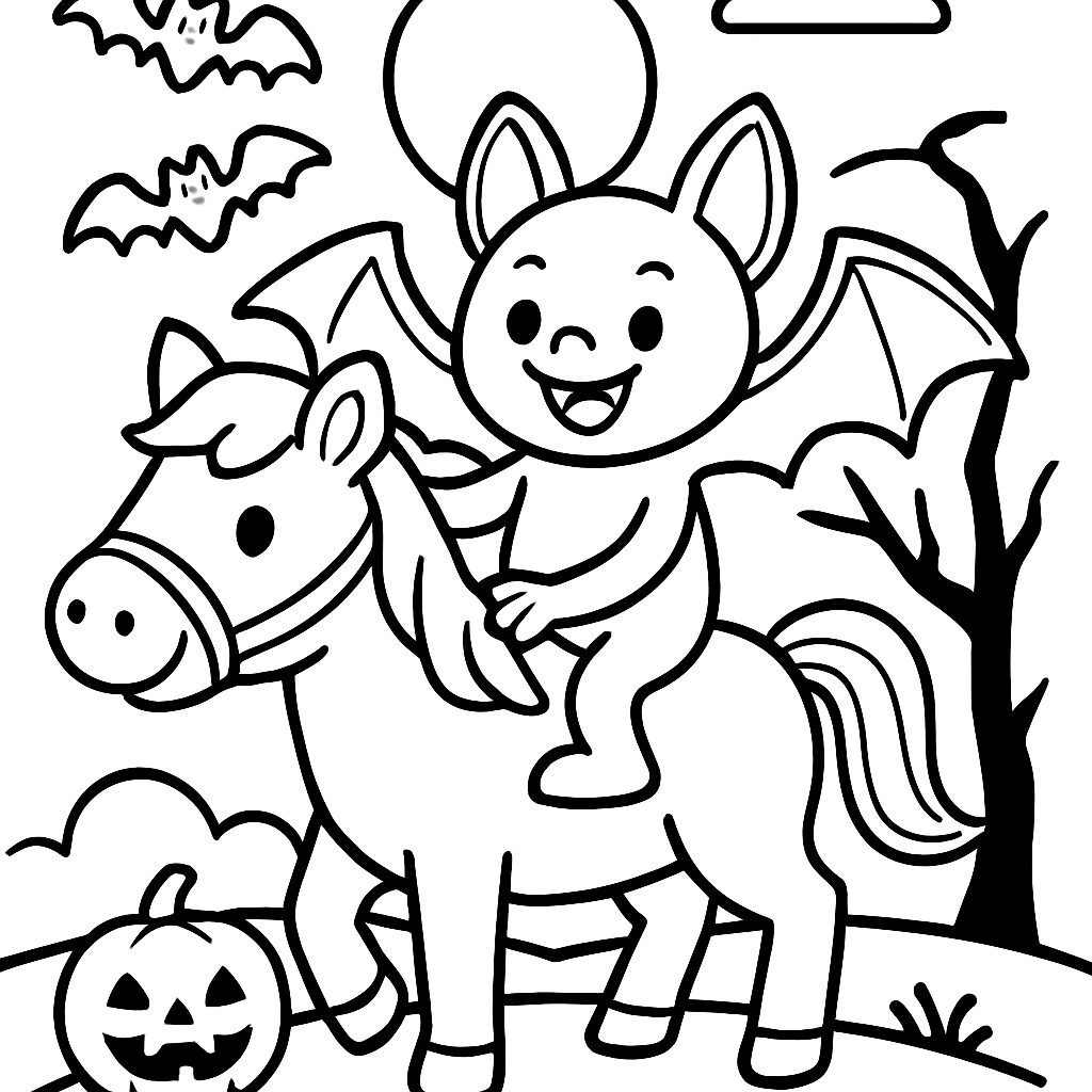 Un pipistrello sorridente con ali su un cavallo, circondato da alberi e un zucchetto di Halloween, ideale per il disegno da colorare.