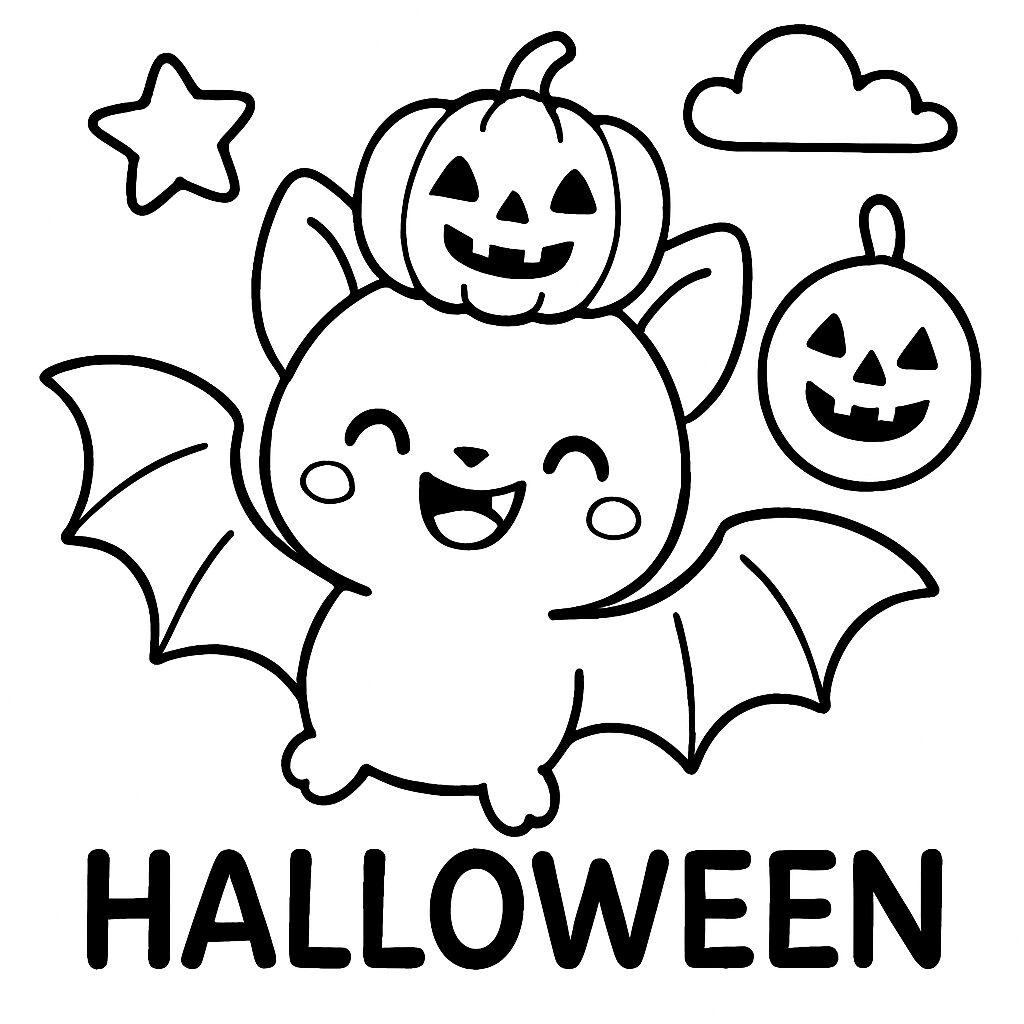 Un pipistrello sorridente con due zucche in cima alla testa, circondato da stelle e nuvole, perfetto per un disegno da colorare di Halloween.