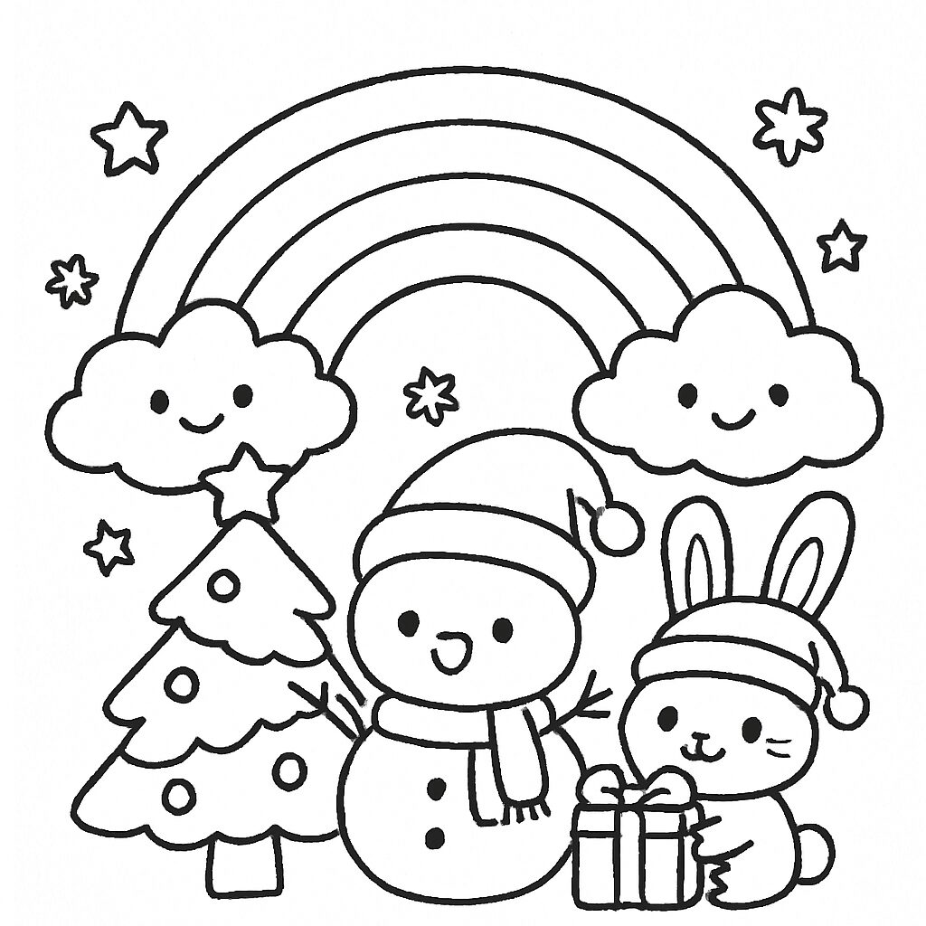 Un pupazzo di neve sorridente con un coniglio e un albero di Natale, sotto un arcobaleno e nuvole felici, ideale per un disegno da colorare.