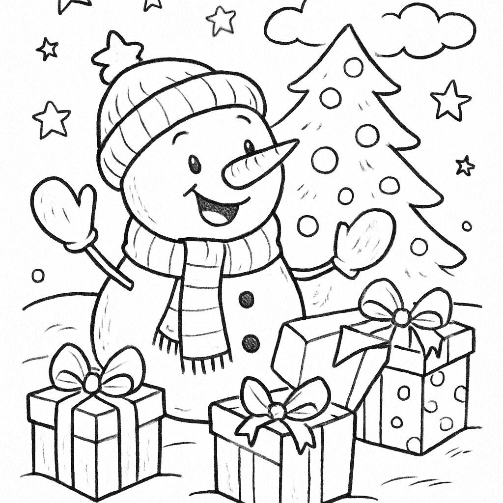 Un pupazzo di neve sorridente indossa un berretto e una sciarpa, circondato da regali e un albero di Natale, ideale per un disegno da colorare.