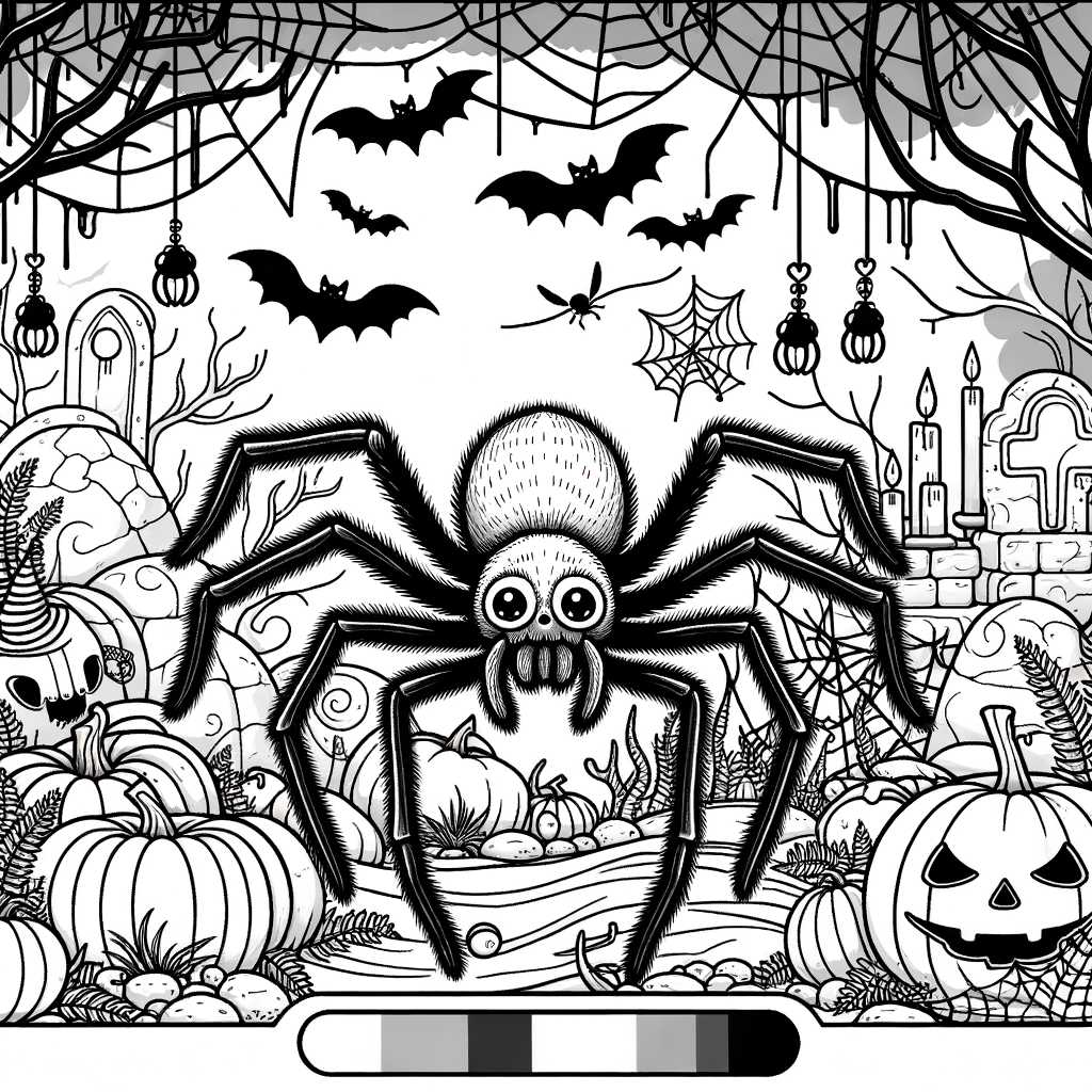 Un ragno grande e buffo si trova in un paesaggio di Halloween, circondato da zucche, pipistrelli e ragnatele, ideale per un disegno da colorare.