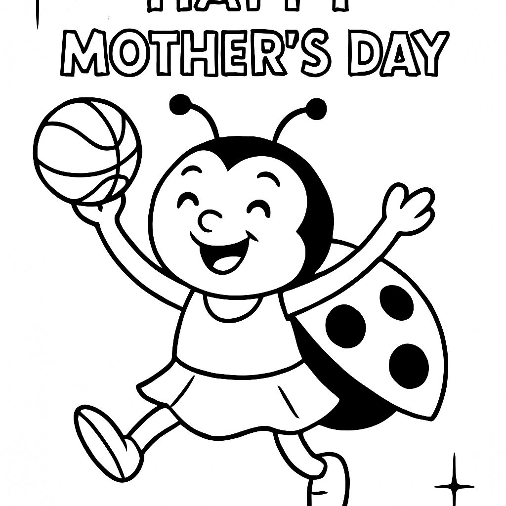 Una coccinella felice che gioca con un pallone, festeggiando la Festa della Mamma.