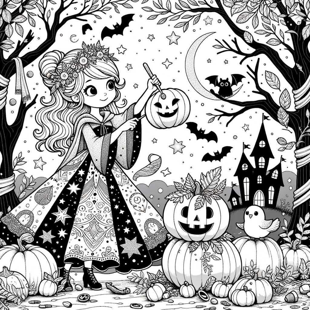 Una ragazza in un vestito magico intaglia una zucca sorridente tra altre zucche, pipistrelli e un castello, perfetto per Halloween.