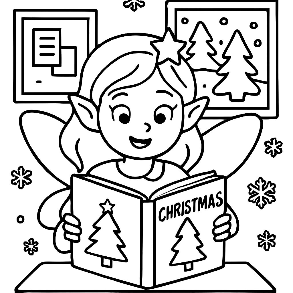 Disegno da colorare di un’elfa che legge un libro di Natale
