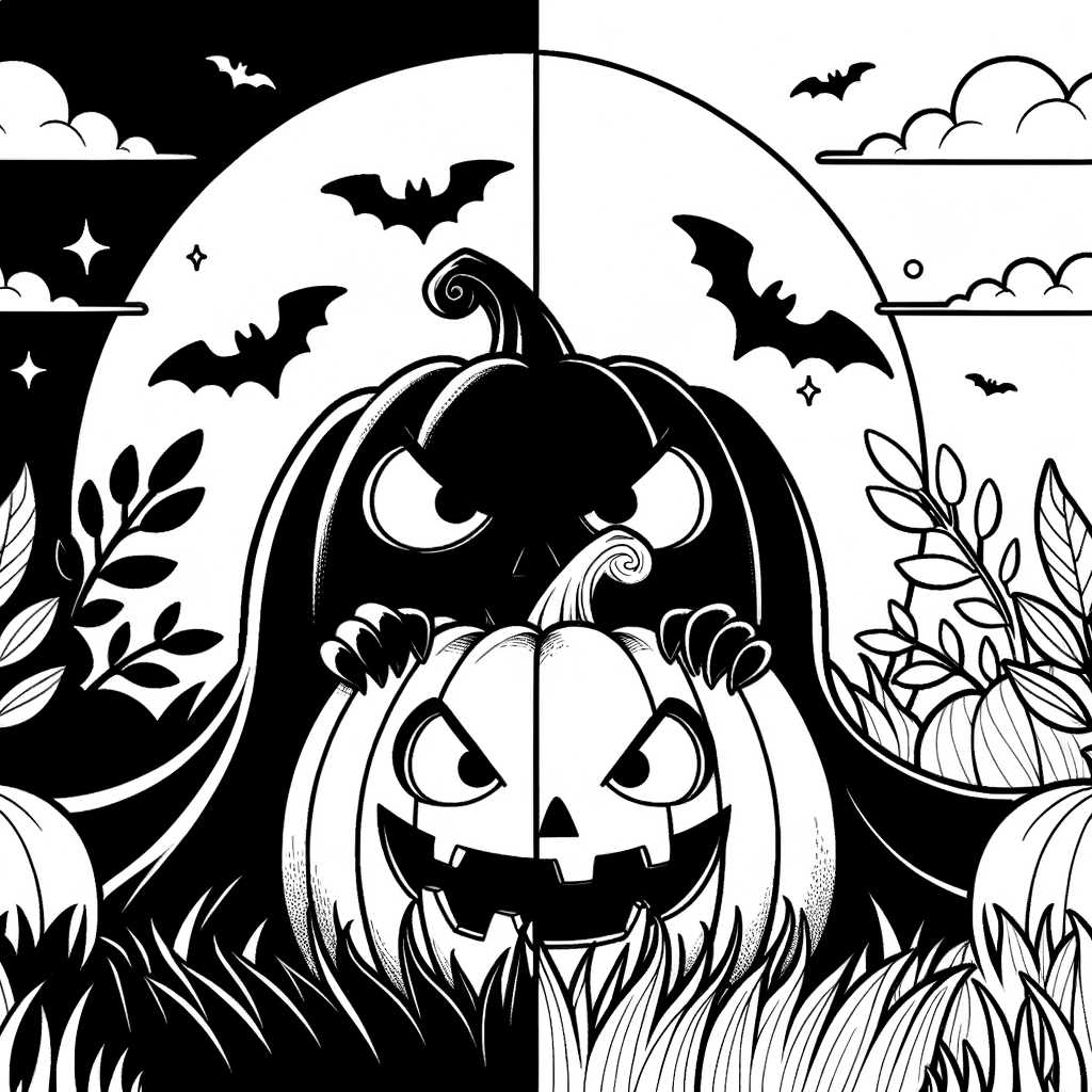 Un disegno da colorare che rappresenta un’illustrazione spettrale con due zucche, un’ombra minacciosa e pipistrelli che volano nel cielo notturno.