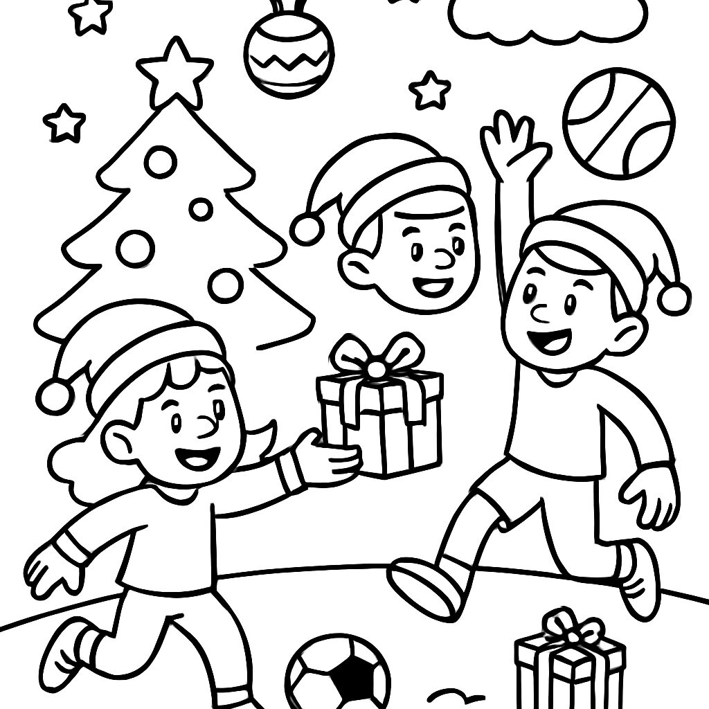 Disegno da colorare di bambini che giocano con regali e una decorazione natalizia.
