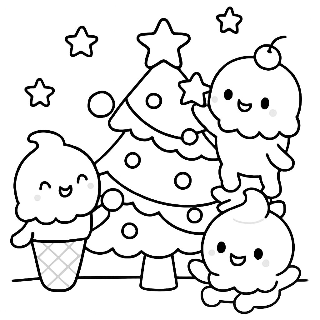 Disegno da colorare di simpatici gelati che decorano un albero di Natale con stelle e palline.