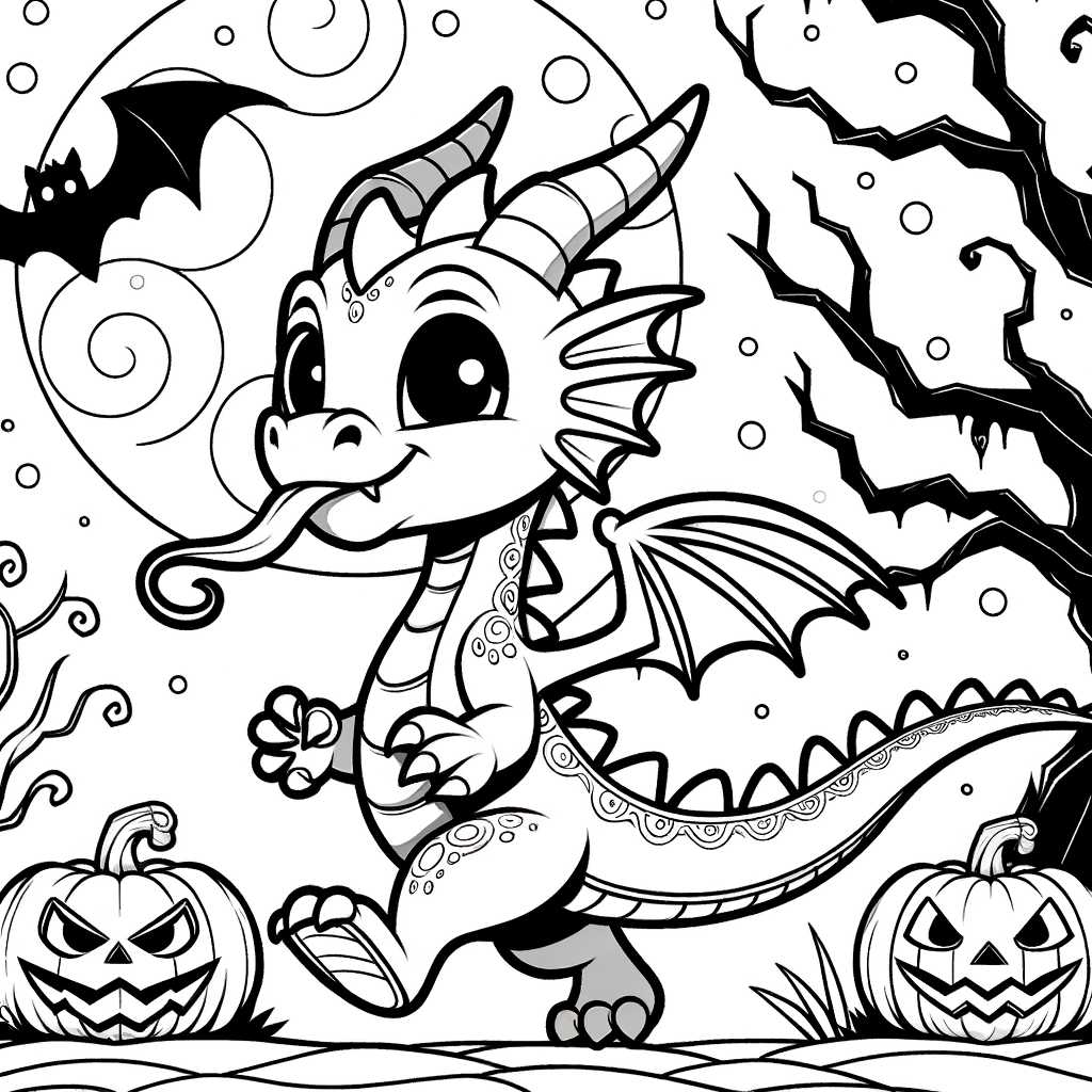 Un simpatico drago con ali, che gioca tra zucche e un pipistrello, ideale per un disegno da colorare.