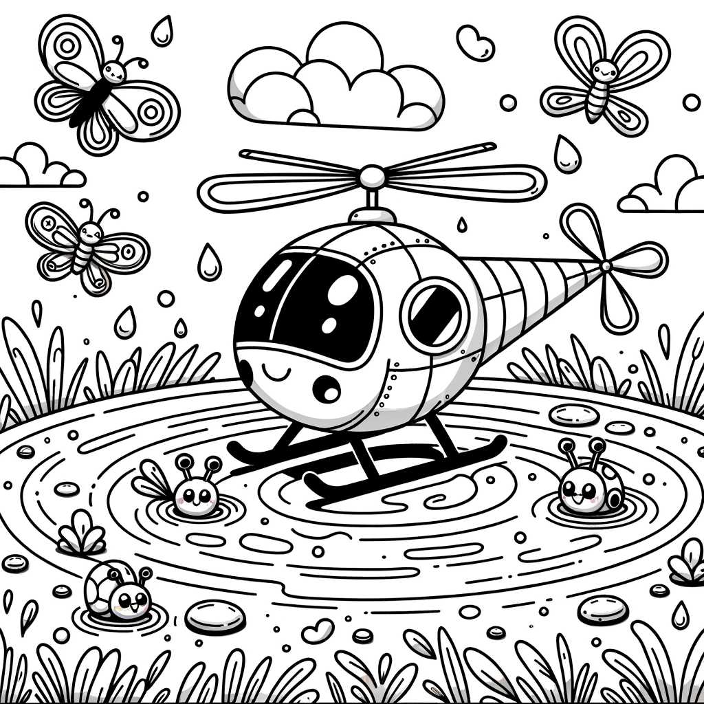 Un elicottero sorridente vola sopra uno stagno, circondato da farfalle e lumachine, con nuvole e gocce d’acqua nell’aria.