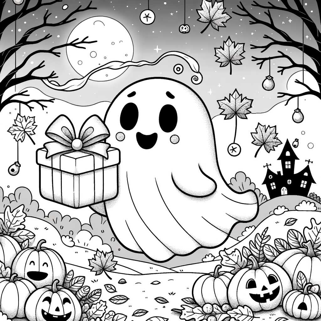 Disegno da colorare di un simpatico fantasma che porta un regalo tra zucche e foglie autunnali, perfetto per Halloween.