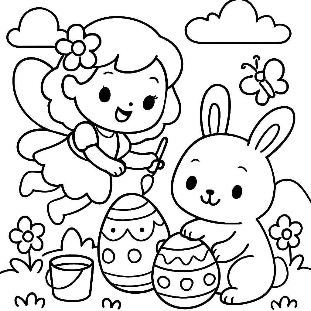 Una fata felice e un coniglio si divertono a dipingere uova pasquali in un prato fiorito.