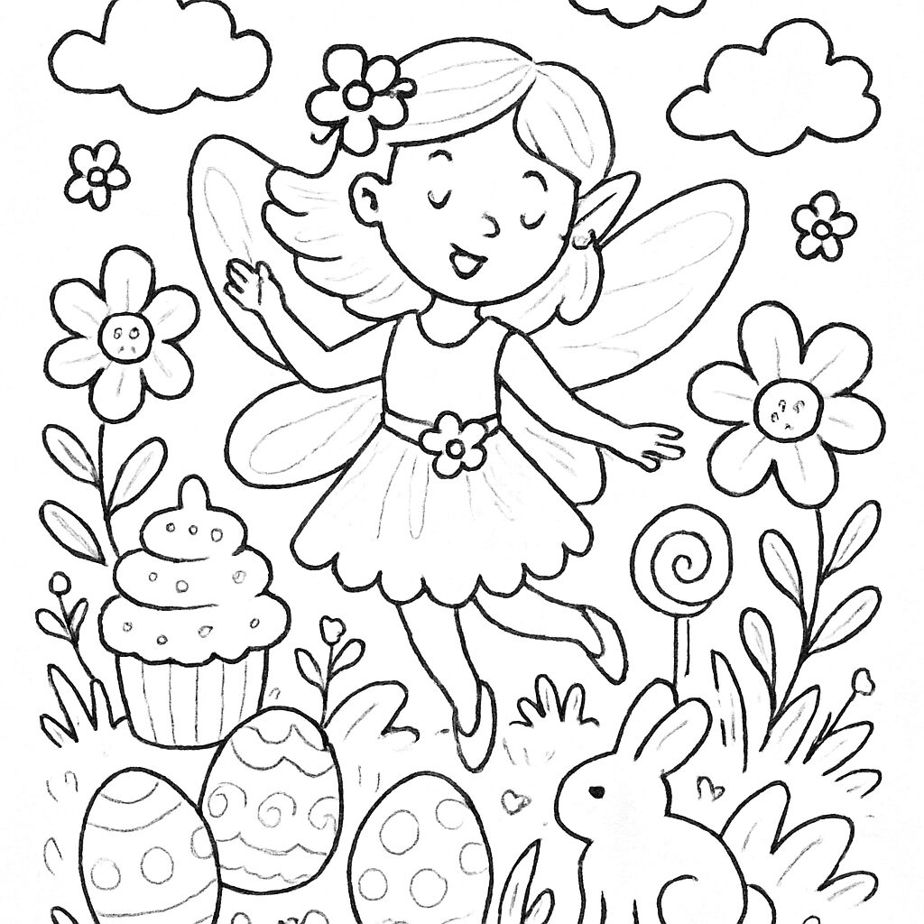 Disegno da colorare di una fata sorridente circondata da fiori, un coniglio, dolci e uova decorate.