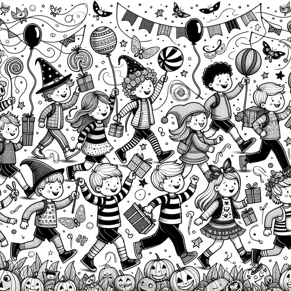 Un gruppo di bambini gioiosi corre con regali e palloncini, circondati da dolci e farfalle, in un’atmosfera festosa da colorare.