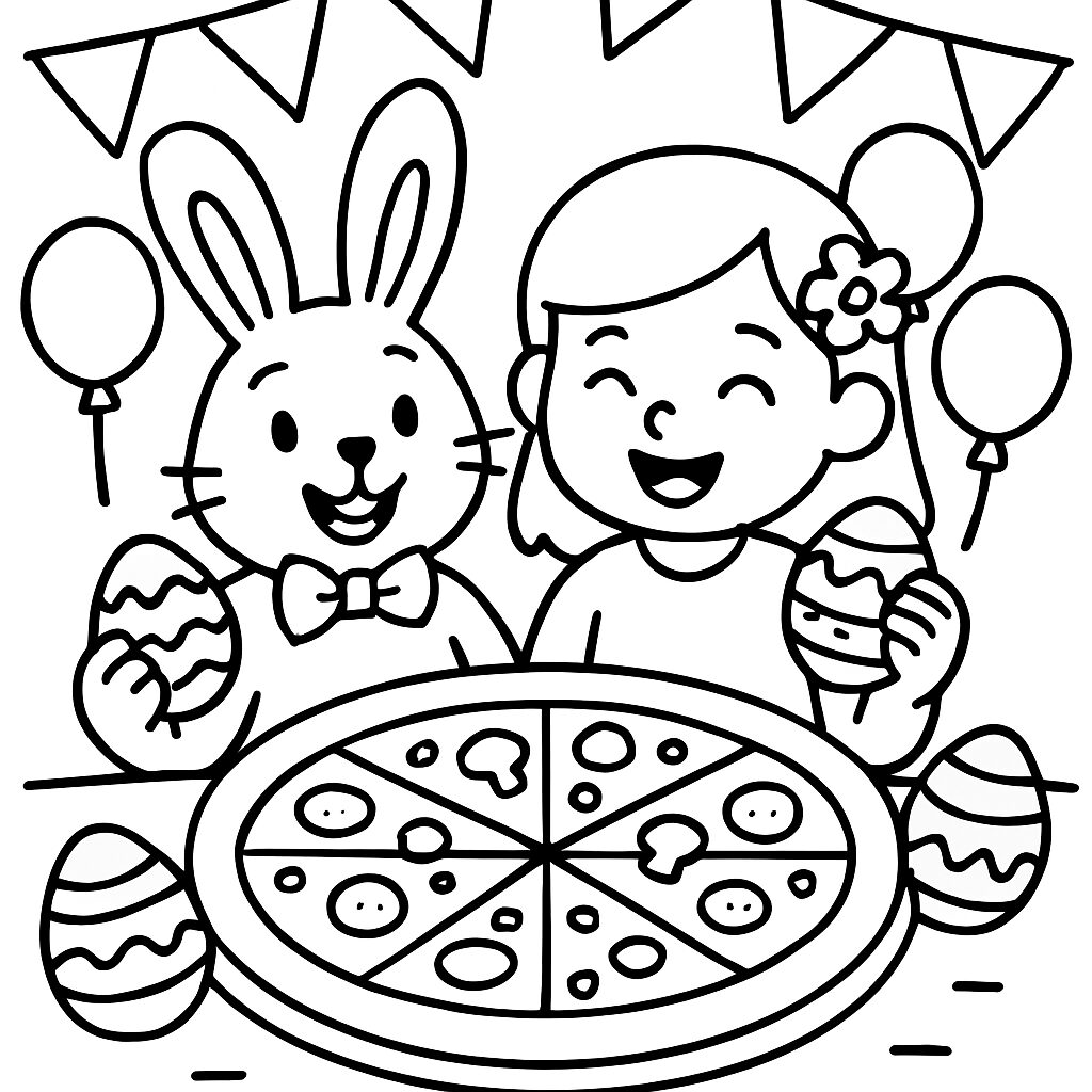 Disegno da colorare di una bambina e un coniglio che festeggiano Pasqua con uova colorate e una pizza.