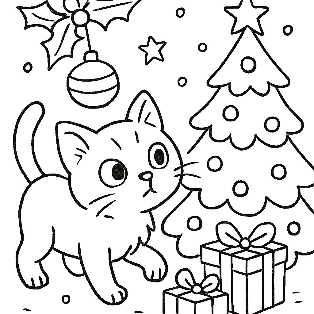 Disegno da colorare di un gatto che esplora un albero di Natale decorato con regali e ornamenti.