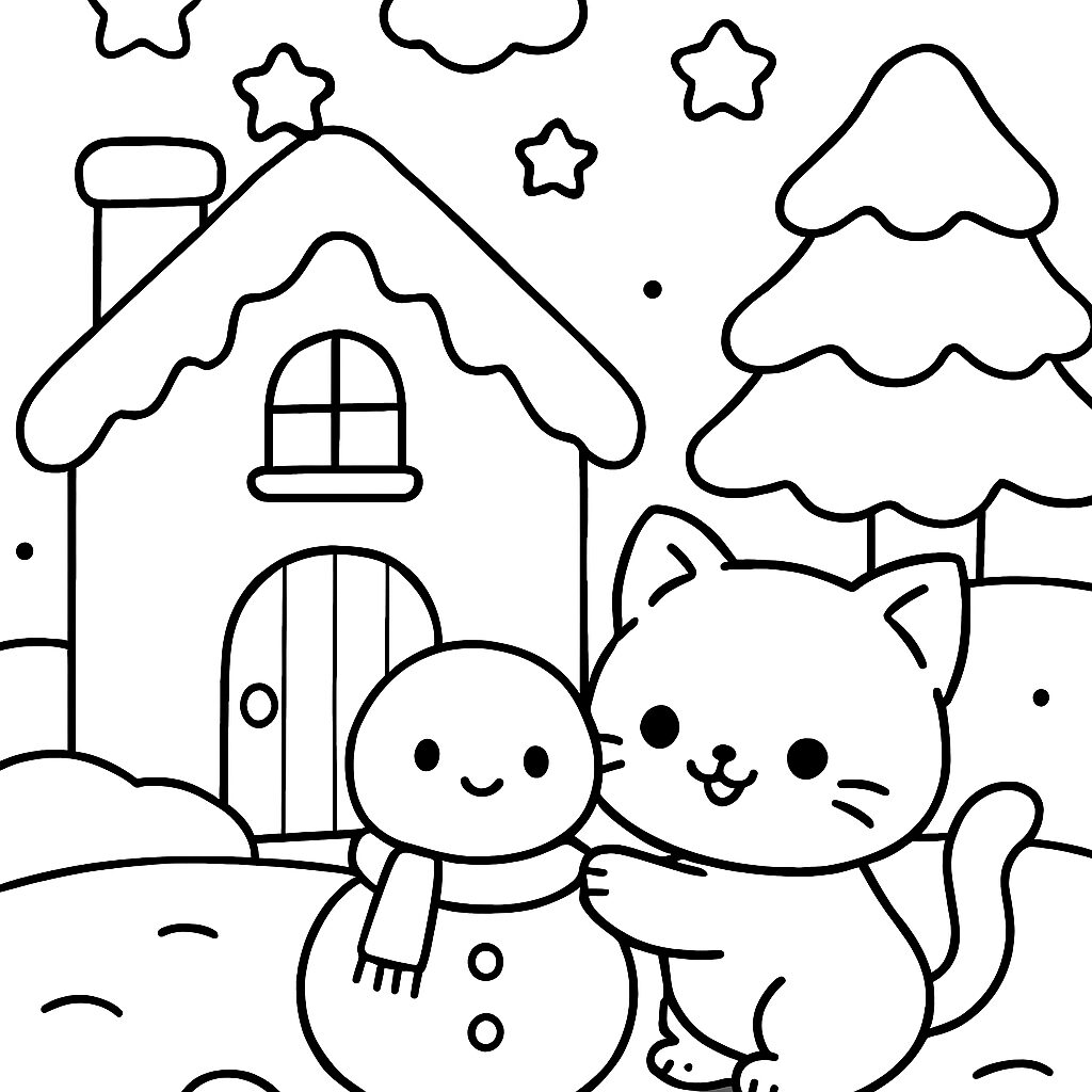 Un adorabile gatto abbraccia un pupazzo di neve davanti a una casetta, circondati da alberi e stelle, in un disegno da colorare invernale.