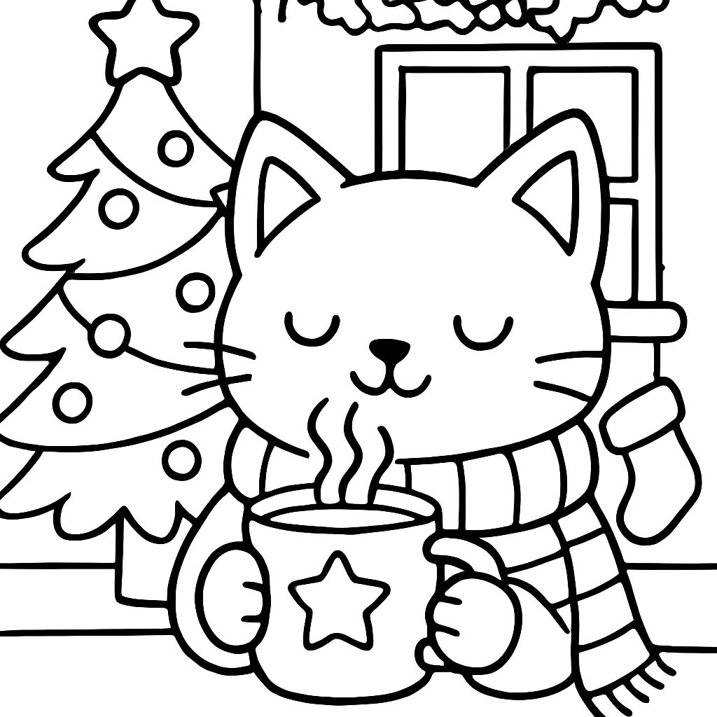Un disegno da colorare di un gatto che sorseggia una bevanda calda, circondato da un albero di Natale decorato e una casa accogliente.