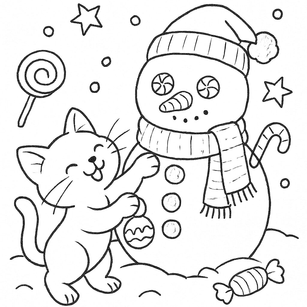 Un adorabile gatto gioca con un pupazzo di neve decorato, circondato da stelle e dolci. Disegno da colorare di un momento invernale gioioso.