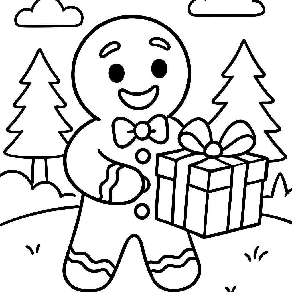 Un disegno da colorare di un omino di pan di zenzero felice che tiene un regalo, circondato da alberi e nuvole.