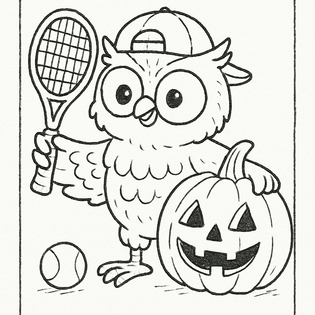 Un gufo indossa un cappellino e tiene una racchetta da tennis accanto a una zucca di Halloween, pronto per divertirsi con un disegno da colorare.