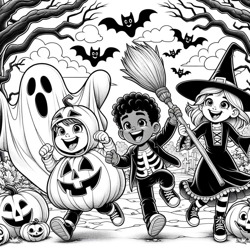 Un gruppo di bambini mascherati festeggia Halloween, con un fantasma, zucche e pipistrelli in un’ambientazione spettrale.