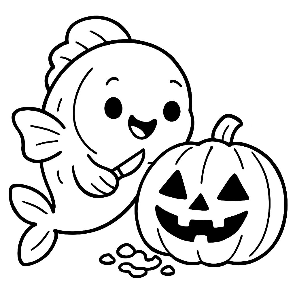 Un pesce sorridente intaglia una zucca di Halloween, pronto per il divertimento. Disegno da colorare di Halloween.