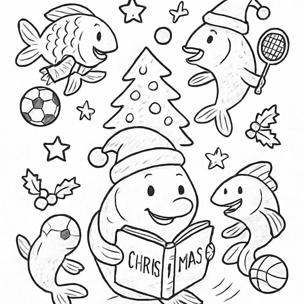 Un pesce in un cappello di Natale legge un libro di Natale, circondato da altri pesci, una pianta di agrifoglio e decorazioni natalizie, ideale per un disegno da colorare.
