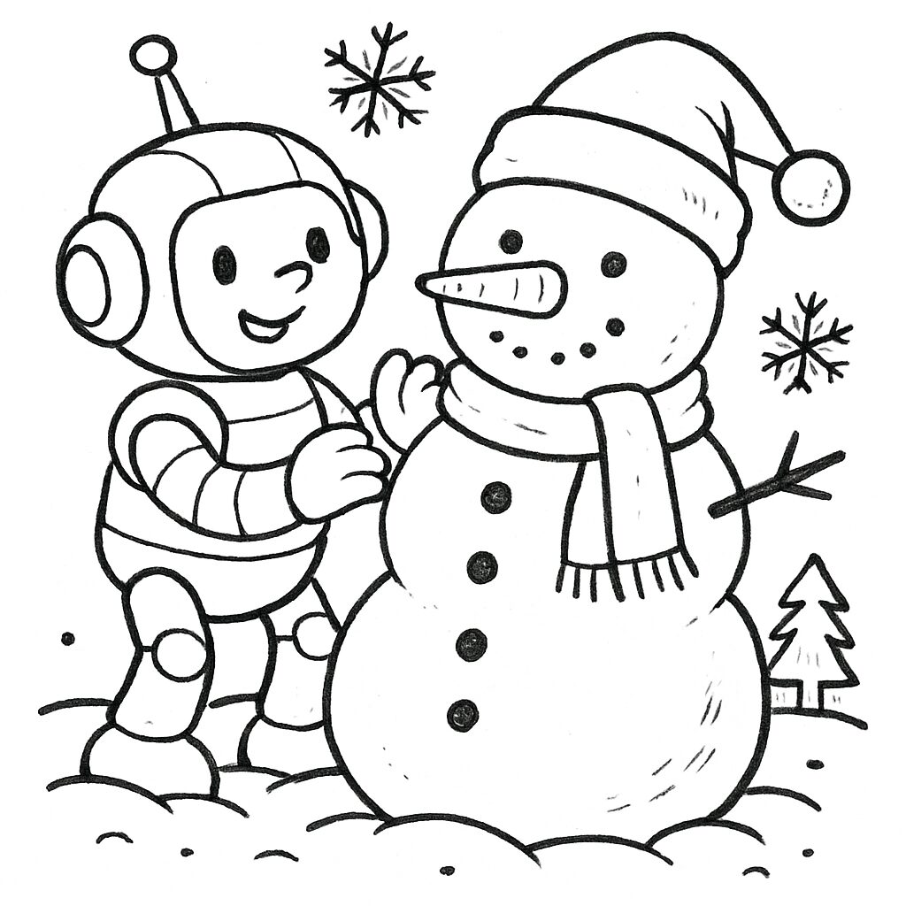 Un robot sorridente gioca con un pupazzo di neve, circondati da fiocchi di neve e un albero, ideale per un disegno da colorare.