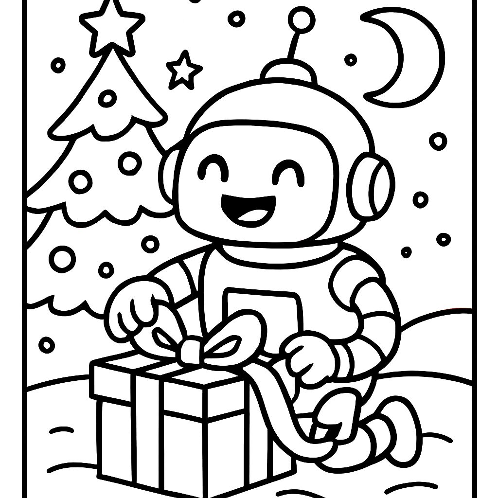 Un disegno da colorare di un robot sorridente che apre un regalo accanto a un albero di Natale, con stelle e luna sullo sfondo.