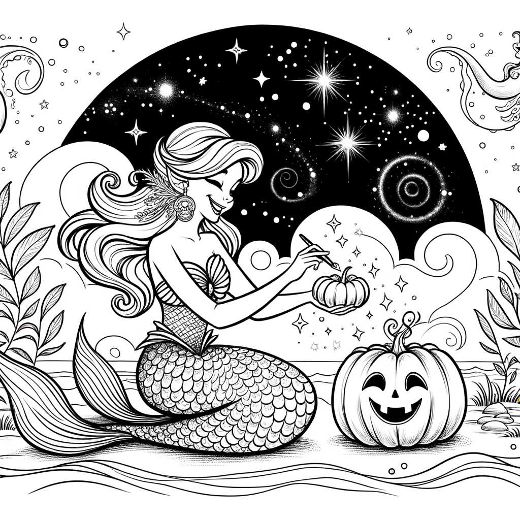 Una sirena sorridente intaglia una zucca su una spiaggia, circondata da stelle e nuvole, mentre la luna piena illumina il cielo.