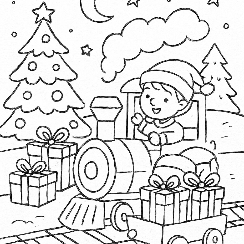 Un disegno da colorare che rappresenta un bambino felice su un treno natalizio, circondato da alberi di Natale e regali.