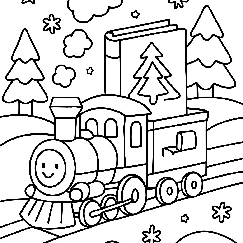 Un treno sorridente trasporta un libro decorato con un albero di Natale, circondato da alberi e nuvole. Disegno da colorare per bambini.
