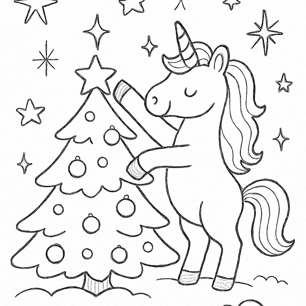 Disegno da colorare di un unicorno che decora un albero di Natale con stelle e ornamenti.