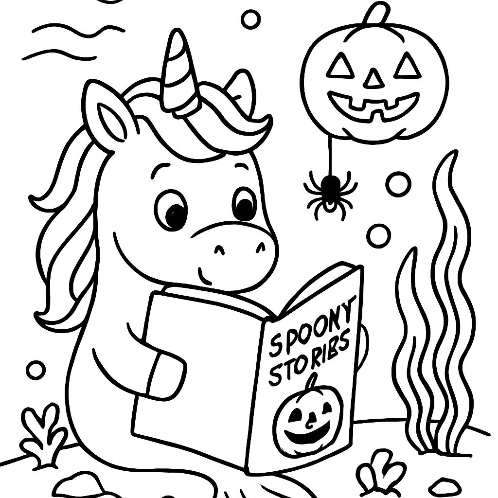 Un unicorno immerso nella lettura di un libro intitolato ‘Spoony Stories’, circondato da elementi festivi come una zucca e un ragno, perfetto per un disegno da colorare.